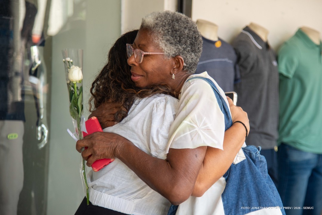 Assim, o impacto foi imediato e visível. Para Maria Eduarda, 22 anos, vendedora, o gesto foi uma surpresa marcante. Ao receber a flor e um abraço, ela compartilhou sua emoção. “Foi a primeira vez que ganhei uma flor. E, quando a moça me deu um abraço, não consegui segurar as lágrimas. Estou muito feliz e, com certeza, esse gesto melhorou meu dia”, disse.
