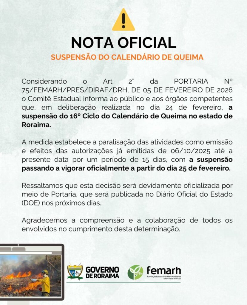 Após Boa Vista enfrentar dois dias com o céu encoberto por fumaça, o Governo então decidiu suspender o calendário de queimadas. A decisão está publicada em nota nas redes sociais da Fundação Estadual de Meio Ambiente e Recursos Hídricos (Femarh) nesta terça-feira, 24.