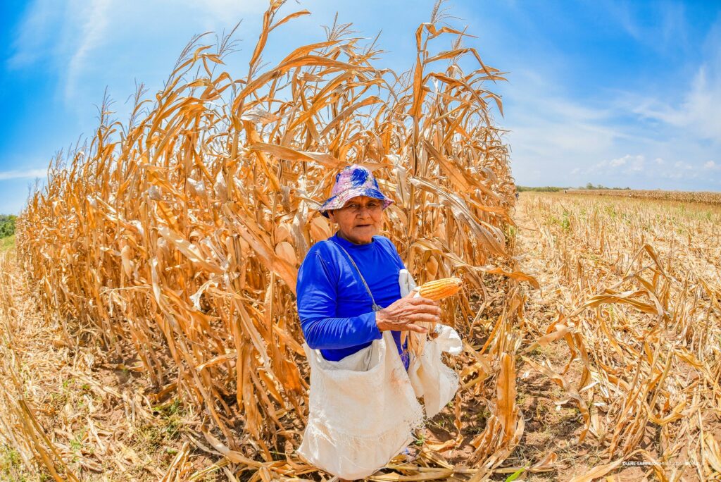 Quem trabalhou por anos no campo também não ficou de fora, claro, agora em um ritmo mais lento, mas com muito a ensinar aos jovens. É o caso dos idosos que também estão no processo. Nelcia Paixão, 73 anos, esteve a vida toda na roça e marcou presença na colheita. No rastro da colheitadeira, a idosa resgatou as espigas de milho que ficavam para trás e garantiu 100% de aproveitamento.