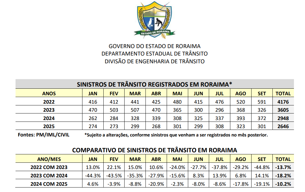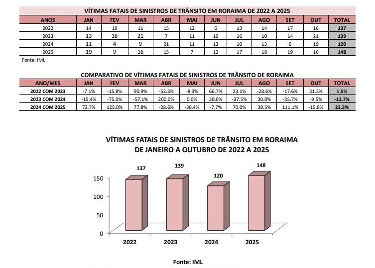 Roraima registrou cerca de 148 mortes decorrentes de acidentes de trânsito entre janeiro e outubro de 2025, um aumento de 23,3% em relação ao mesmo período de 2024. Os dados foram divulgados pelo Departamento Estadual de Trânsito de Roraima (Detran-RR).