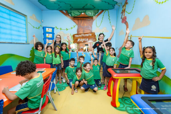 A Escola Municipal Cunhatã Curumim inaugurou, nesta sexta-feira, 30, um espaço inovador que promete transformar a rotina pedagógica das crianças da Educação Infantil. A sala temática “TecnoFloresta Mágica” foi criada com o objetivo de unir tecnologia e natureza de forma lúdica, interativa e educativa, estimulando o raciocínio lógico, a coordenação motora e a criatividade dos alunos.