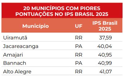 Os dados são do Índice de Progresso Social 2025 (IPS Brasil). A pesquisa classifica, portanto, a qualidade de vida nos 5.570 municípios do país.
