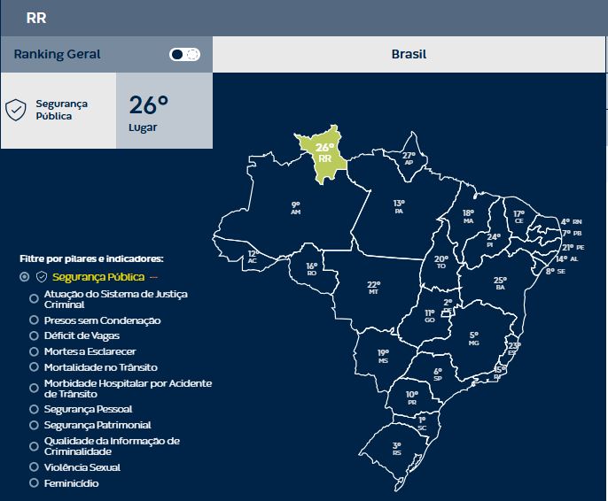 O estado também havia chegado à mesma marca em 2024, ao descer duas posições do ranking em relação ao ano anterior. Em 2025, Roraima apresentou déficit em indicadores como Qualidade da Informação de Criminalidade, Violência Sexual e Feminicídio.