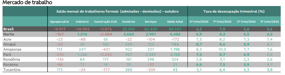 Em relação ao mercado de trabalho, Roraima apresentou saldo positivo em empregos formais em outubro, mas em ritmo inferior comparado a outros estados do Norte.