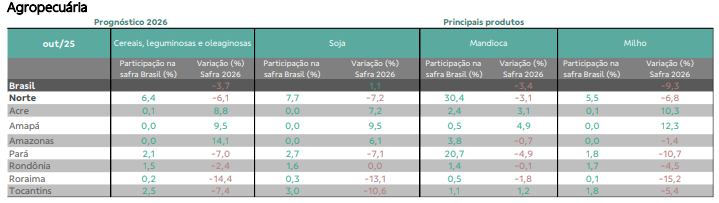 Na agropecuária, Roraima apresenta uma das maiores retrações proporcionais da região Norte. O estado, que responde por cerca de 0,2% da produção agrícola nacional, tem previsão de queda de 14,4% na safra de 2026, com recuo em culturas como soja, milho e mandioca.