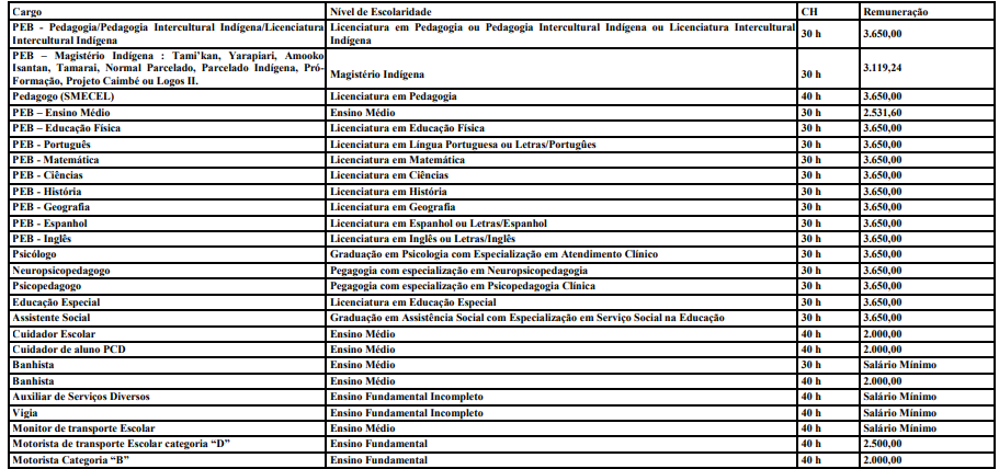 O seletivo contempla diversas áreas, incluindo professores da educação básica, auxiliar de serviços diversos, banhista, monitor de transporte escolar, cuidador escolar, psicólogo clínico, assistente social, entre outros.