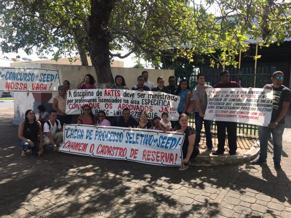 Professores aprovados no concurso da Secretaria Educação e Desporto (Seed) se reuniram em frente ao prédio da pasta na manhã desta segunda-feira (9).
