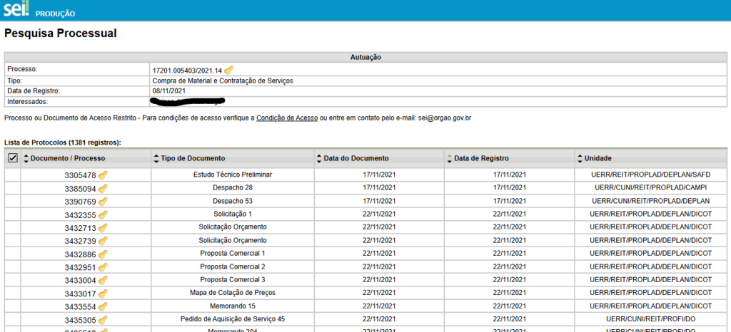 Informações detalhadas sobre o contrato com a empresa, incluindo valores, aditivos e prazos, constam como “fechados” para consulta pública no Sistema Eletrônico de Informações (SEI).