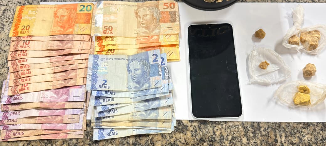 Assim, na revista pessoal, os policiais encontraram com um dos homens uma pedra aparentando ser pasta base de cocaína, além de R$ 325 em dinheiro, distribuídos em notas trocadas. Questionado, o suspeito confessou que realizava a venda de drogas no local e informou que havia mais entorpecentes na residência.