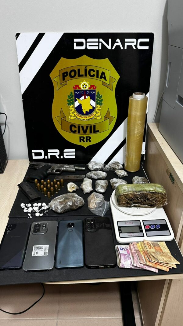 De acordo com a Polícia Civil de Roraima (PCRR), com eles, a equipe ainda apreendeu vários pacotes de skunk, pasta base de cocaína, uma pistola calibre .45, 15 munições do mesmo calibre, balança de precisão, celulares e uma motocicleta.