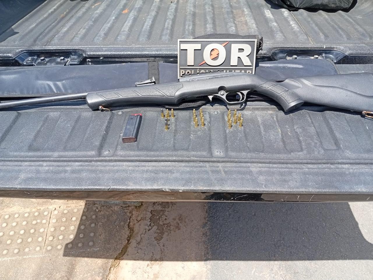 Na abordagem, o condutor, V. S. A., relatou possuir uma arma de fogo no interior do veículo. Onde havia um rifle Calibre 0.22, um carregador com 10 munições e além disso, 9 munições extras do mesmo calibre.