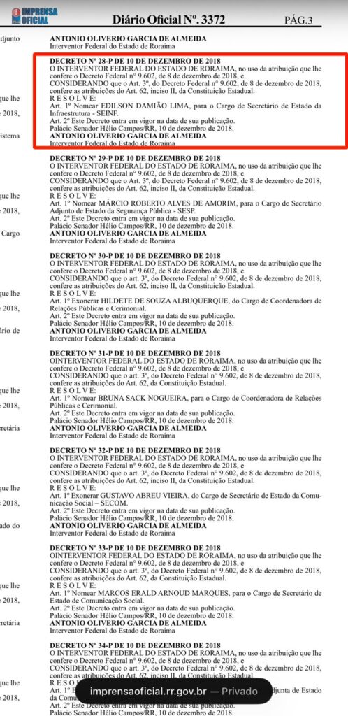 Conforme a Revista Cenarium, na biografia publicada no portal do Governo de Roraima, Edilson Damião confirma ter aceitado o convite para comandar a Secretaria de Infraestrutura, destacando atuação entre 2019 e 2022. Ao ser escolhido como candidato a vice na chapa de reeleição de Denarium, ele se desincompatibilizou do cargo em 1º de abril de 2022, conforme o Decreto 614-P. Após as eleições, retornou à função em 7 de outubro. Segundo a biografia, ao tomar posse como vice-governador, foi novamente nomeado secretário de Infraestrutura, acumulando os dois cargos.