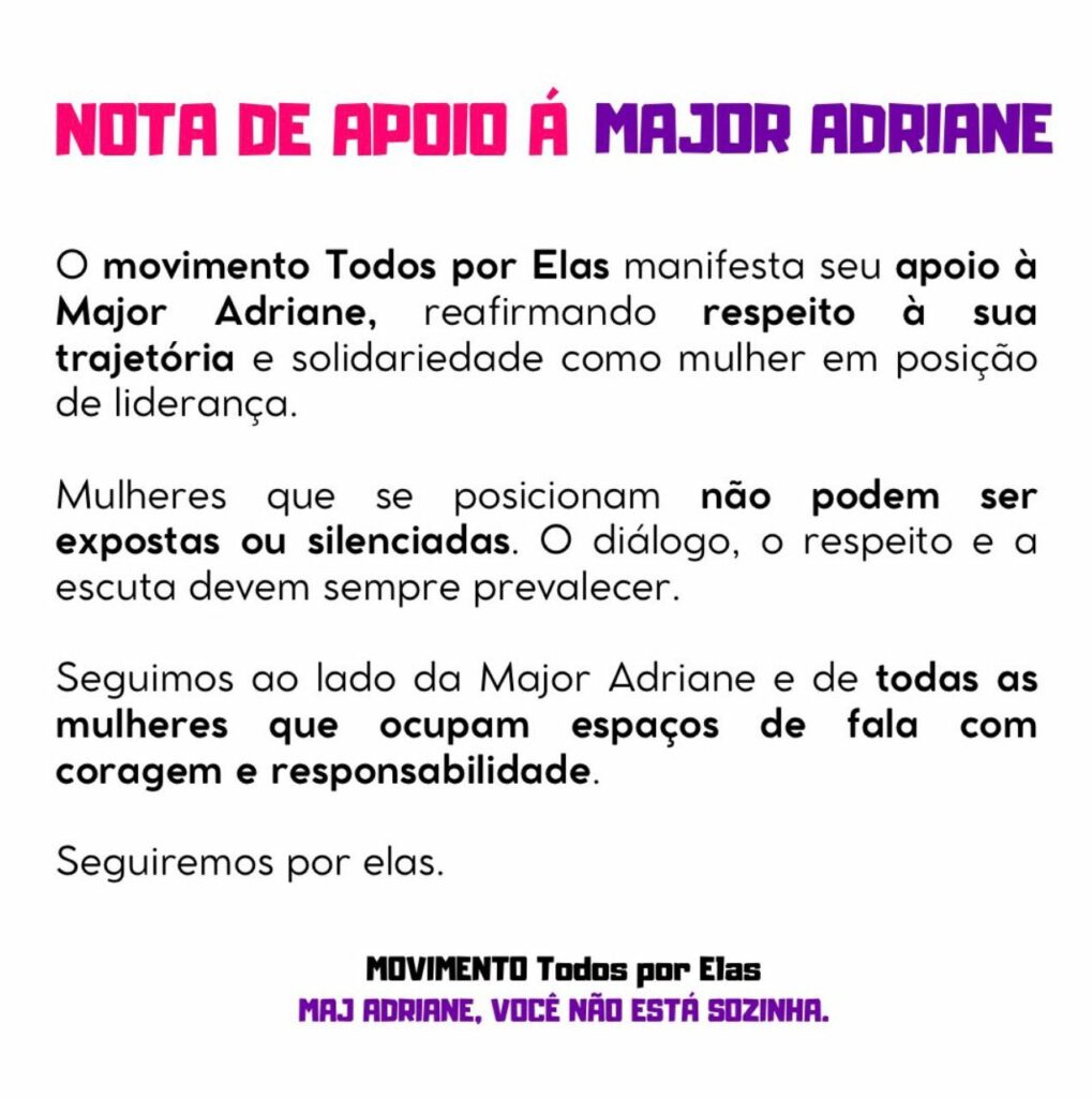 A repercussão do caso gerou uma onda de mensagens de apoio à oficial, inclusive de um projeto que denuncia a violência contra as mulheres. Em nota, o movimento “Todos por Elas” manifestou solidariedade à major Adriane Severo. Segundo a entidade “mulheres que se posicionam não podem ser expostas ou silenciadas” e disse que a militar “não está sozinha”.