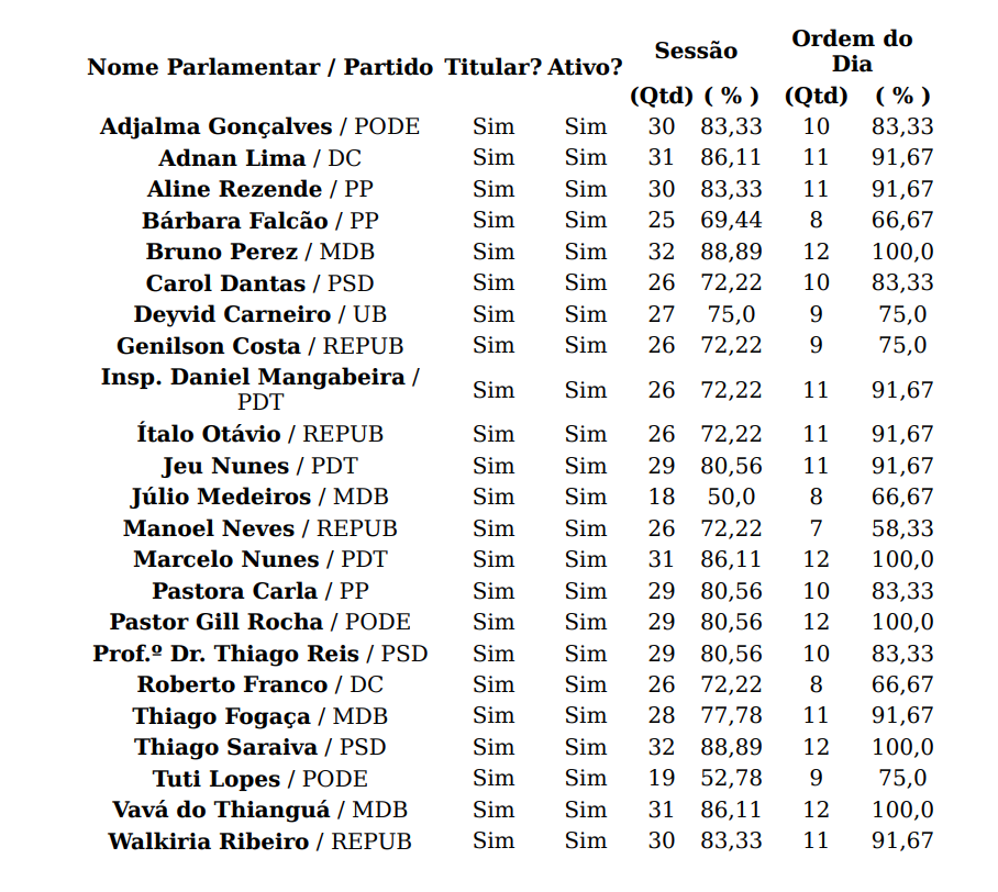 Em seguida, aparecem Vavá do Thianguá (MDB) e Marcelo Nunes (PDT), que registraram presença em 31 sessões e também participaram de todas as ordens do dia.