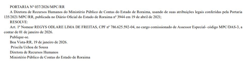 A nomeação, no cargo de assessor especial, está no Diário Oficial do Estado de Roraima (DOE-RR), do dia 28 de janeiro. O salário é de cerca de R$ 14 mil.