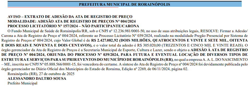 O Fundo Municipal de Saúde Prefeitura de Rorainópolis pretende contratar empresa por R$305.020,00 para locação futura de estruturas e serviços para suprir eventos do município.