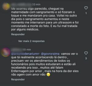 Diversas mães também relataram experiências semelhantes nas redes sociais do Portal Roraima em Tempo. Uma delas contou que foi maltratada na unidade após apresentar sangramento. Outra relatou ter recebido um tratamento “desumano” durante a internação. A maternidade, que deveria garantir acolhimento, segurança e atenção redobrada a cada gestante, especialmente às de alto risco, está muito distante de oferecer um atendimento digno. O mais grave é que o Governo sequer se pronuncia ou demonstra disposição para apurar o que acontece dentro da uidade e, muito menos, para buscar soluções. Falta interesse da gestão (focada no agro) em valorizar as mães e os bebês que dependem do serviço.