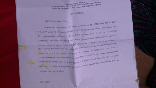 Em 2019, Emelly Paula Costa, de 30 anos, recebeu o diagnóstico de insuficiência cardíaca e hipertensão pulmonar. Com isso, iniciou tratamento com uso do medicamento Bosentana, que, segundo relata a paciente à reportagem da TV Imperial, está em falta na Saúde do Estado.